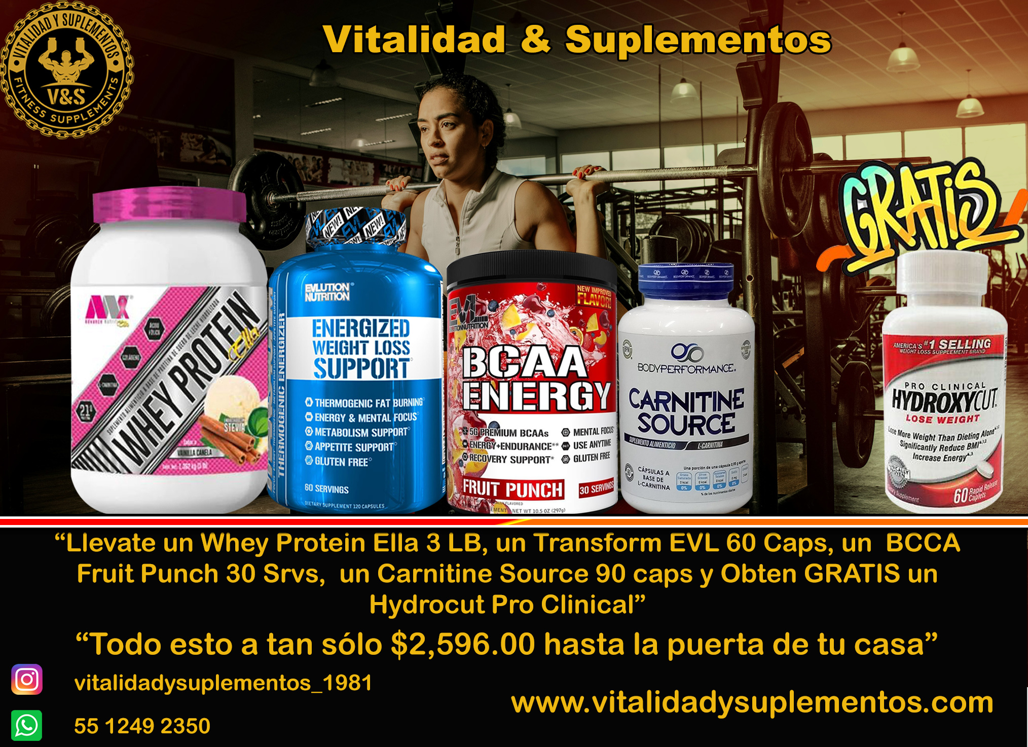 Llevate un Whey Protein Ella 3 LB, un Transform EVL 60 Caps, un BCCA Fruit Punch 30 Srvs, un Carnitine Source 90 caps y Obten GRATIS un Hydrocut Pro Clinical