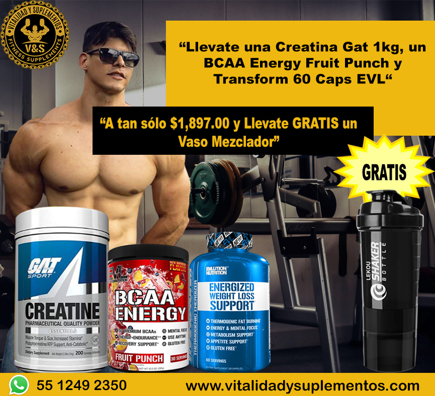 “Llévate una Creatina Gat 1kg, un BCAA Energy Fruit Punch y Transform 60 Caps EVL y obtén GRATIS un Vaso Mezclador”