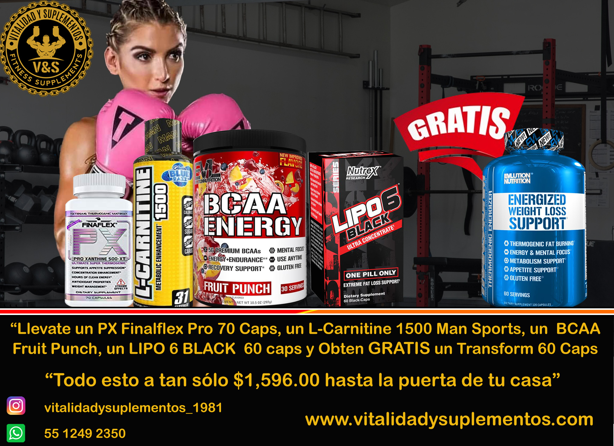 Llevate un PX Finalflex Pro 70 Caps, un L-Carnitine 1500 Man Sports, un BCAA Fruit Punch, un BCAA EVL Nutrition Uva y Obten GRATIS un Transform 60 Caps