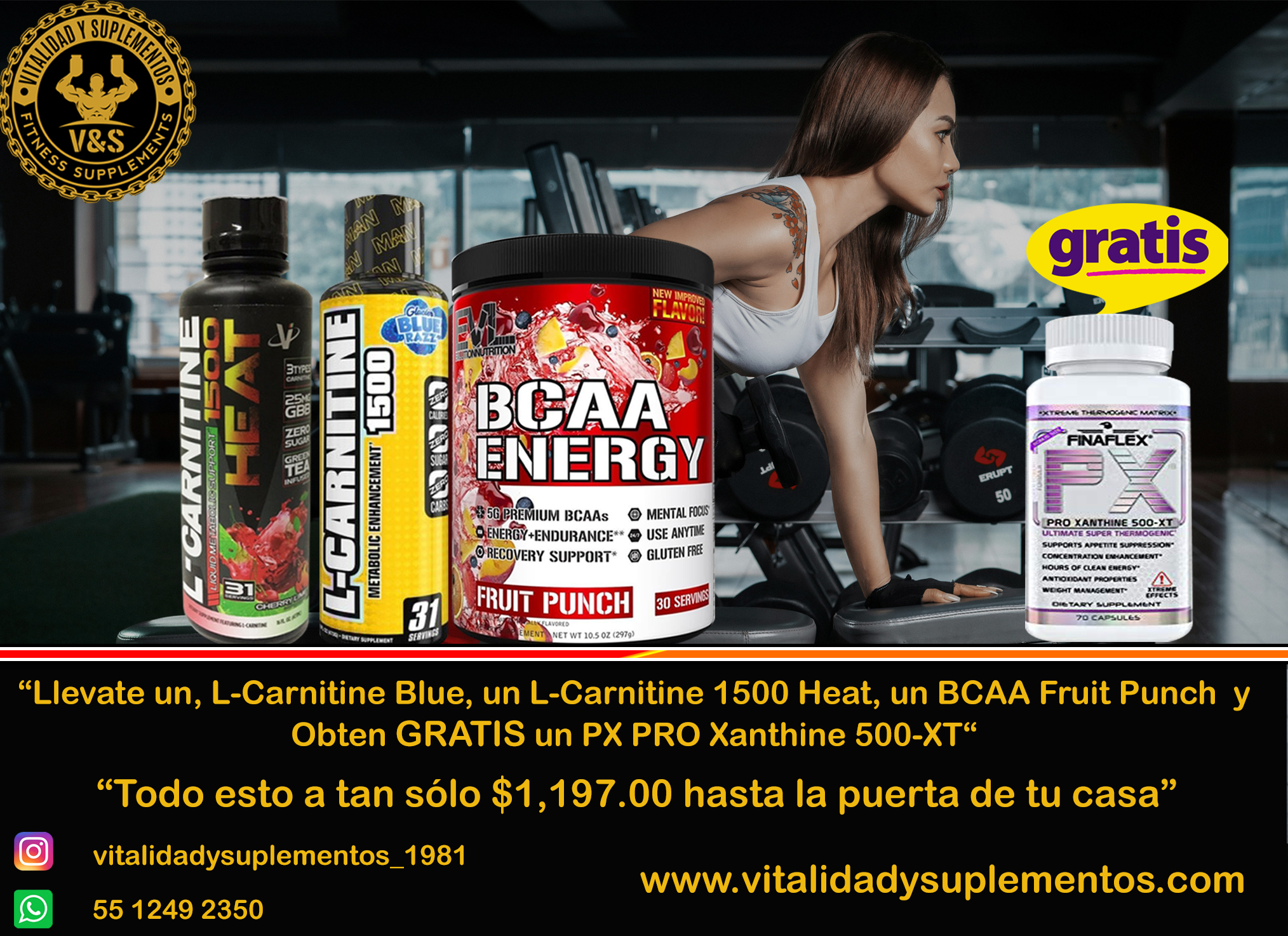 Llevate un, L-Carnitine Blue, un L-Carnitine 1500 Heat, BCAA Fruit Punch y Obten GRATIS un PX PRO Xanthine 500-XT