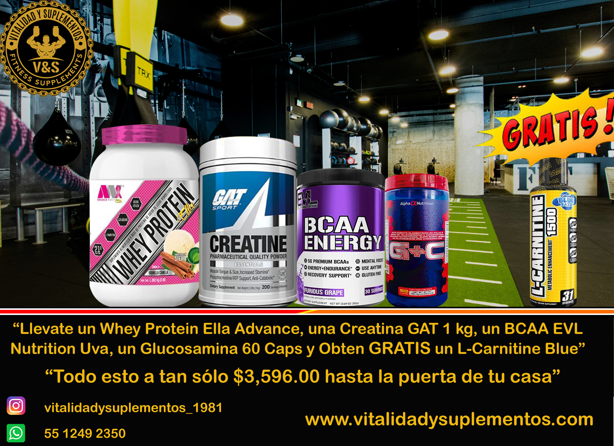 Llevate un Whey Protein Ella Advance, una Creatina GAT 1 kg, un BCAA EVL Nutrition Uva, un Glucosamina 60 Caps y Obten GRATIS un L-Carnitine Blue