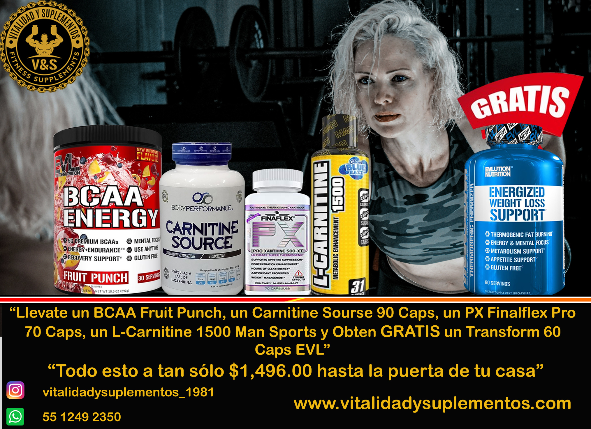 Llevate un BCAA Fruit Punch, un Carnitine Sourse 90 Caps, un PX Finalflex Pro 70 Caps, un L-Carnitine 1500 Man Sports y Obten GRATIS un Transform 60 Caps EVL
